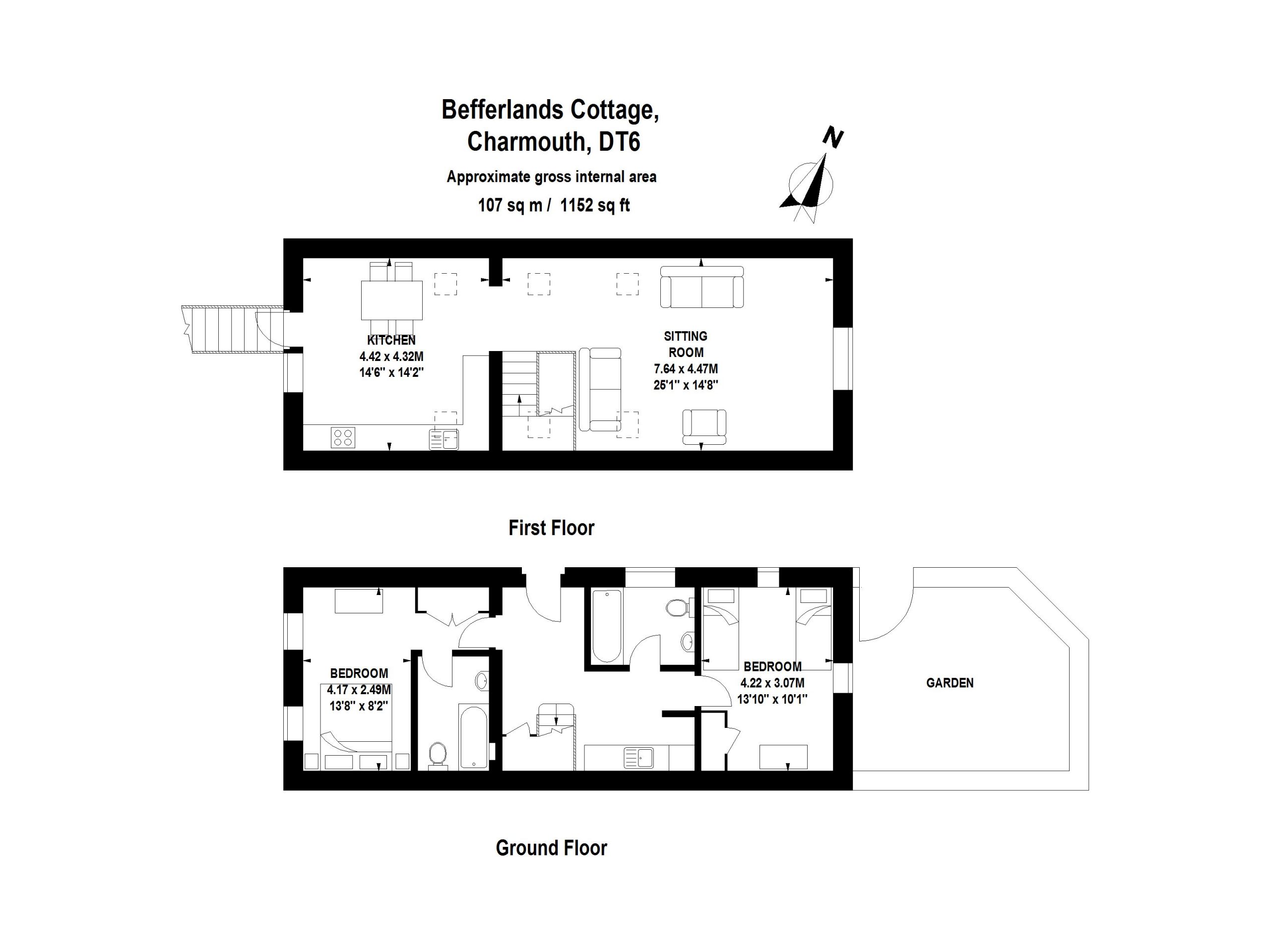 Befferlands Cottage is a converted two-story barn which provides a wonderful and peaceful rural retreat for couples or a family. The well-appointed interior benefits from a very spacious sitting room with high vaulted ceilings which leads to an open plan fully equipped kitchen and dining area. The sitting room benefits from a huge picture window which allows light to flood in and the kitchen has the advantage of a stable door. There are two stylish bedrooms both of which benefit from their own bathrooms. A double with an ensuite bathroom with both bath and shower and a twin room with its own bathroom right next door, again with bath and shower. Both bedrooms are recently refurbished and have ample wardrobe space. The cottage has its own parking and a small private garden perfect for a barbeque.
